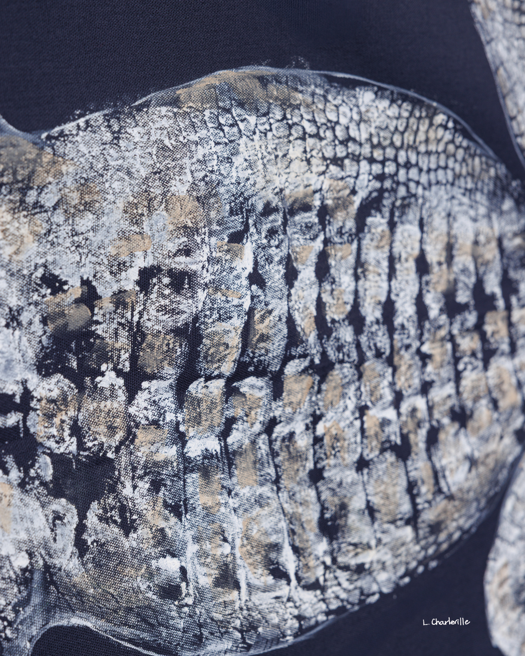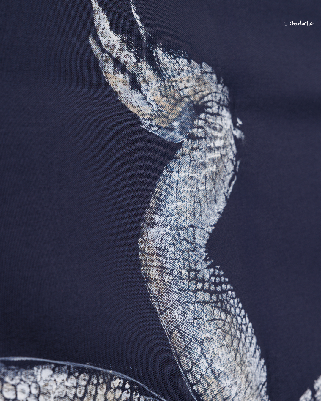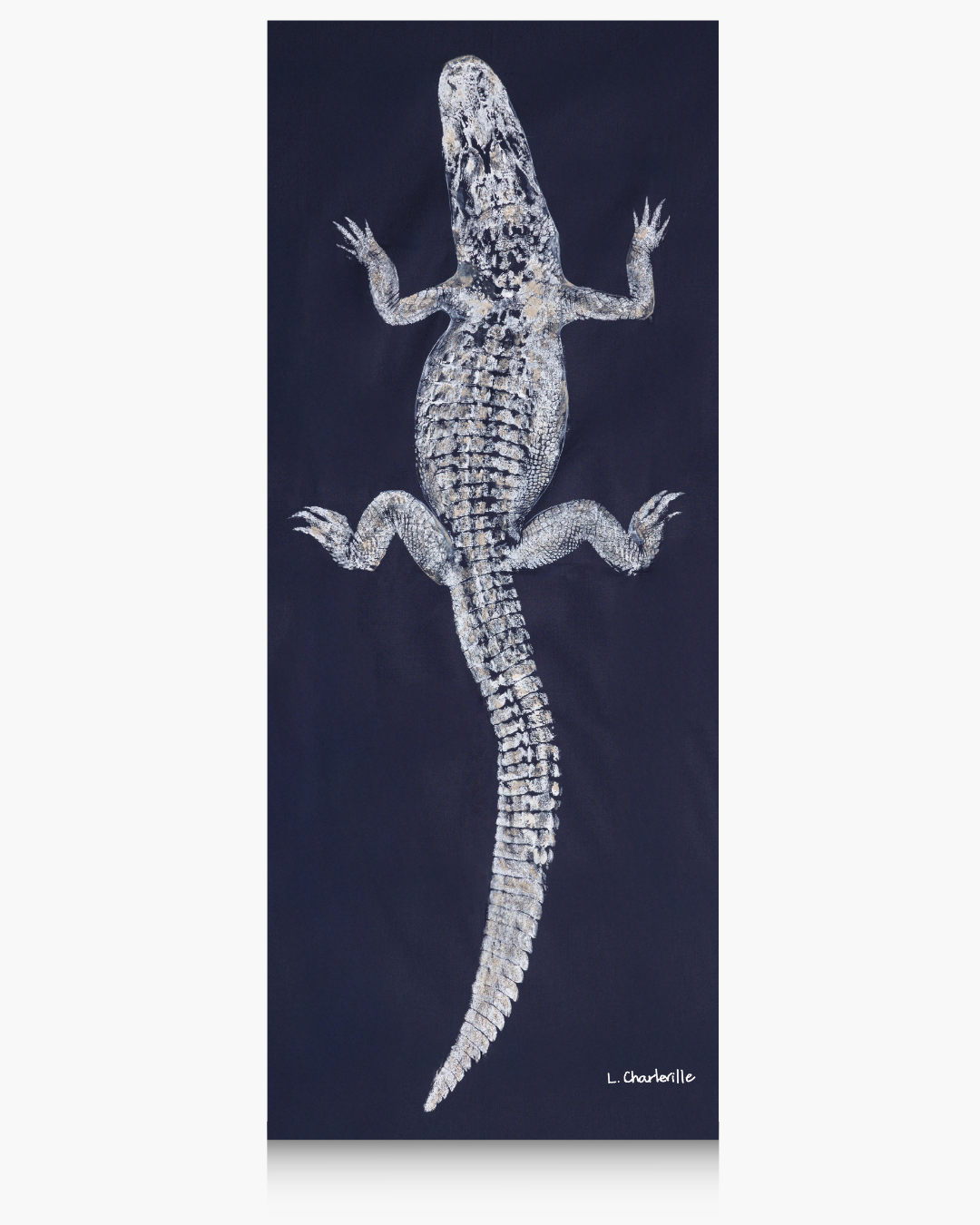 A 6' white alligator on navy fabric with curved tail detailed in gold.