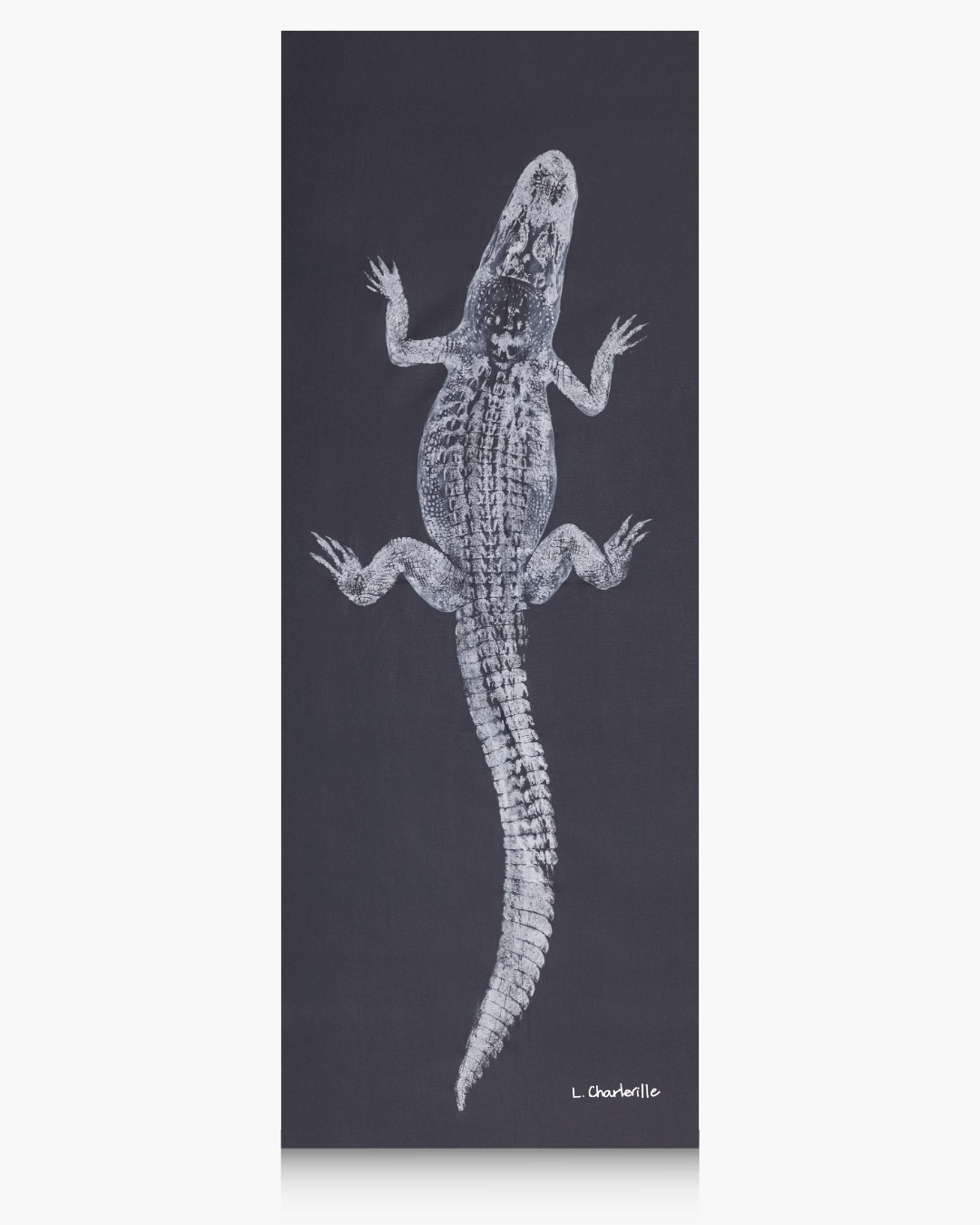 A 5' white alligator on gray fabric featuring a curved tail with gold details.