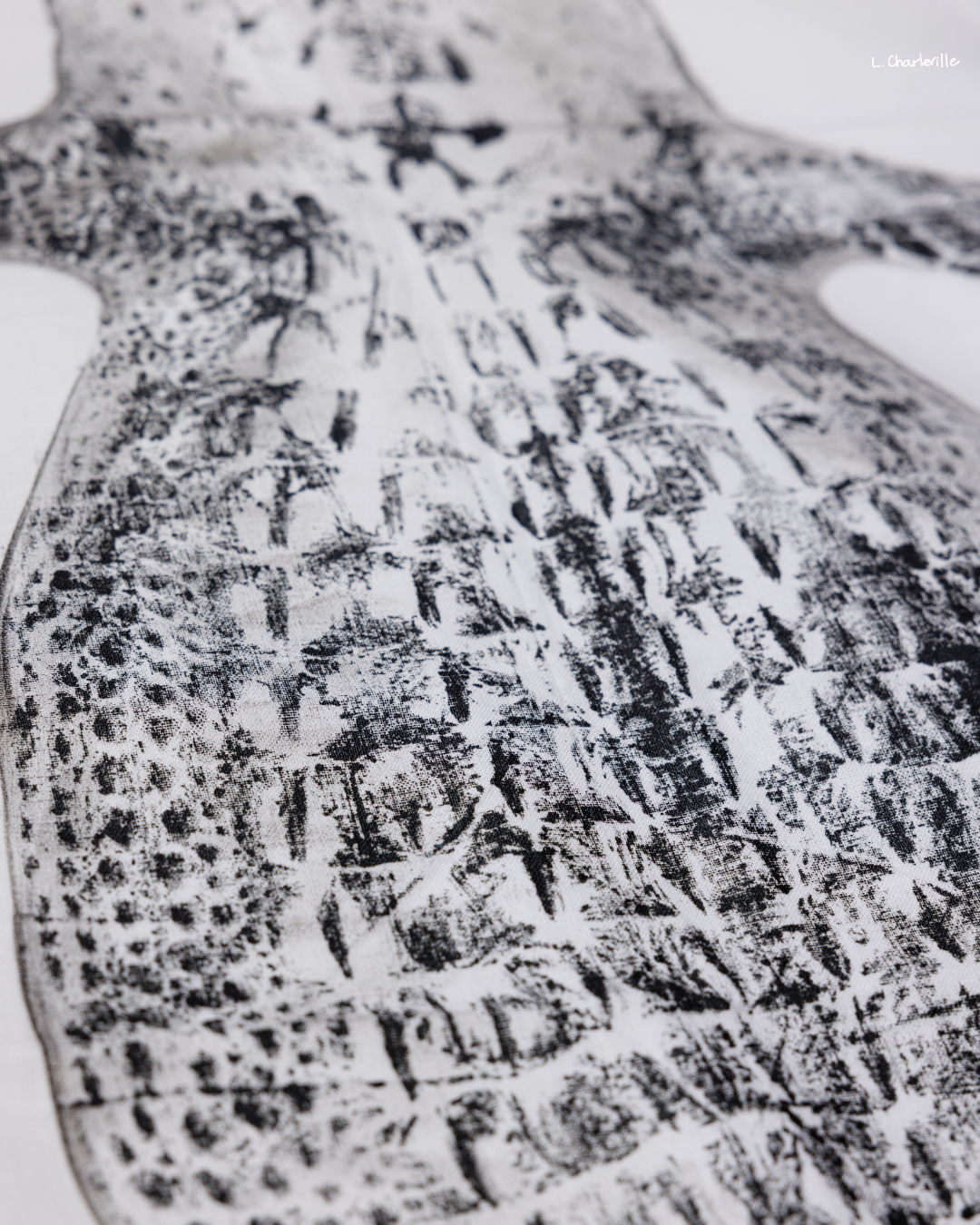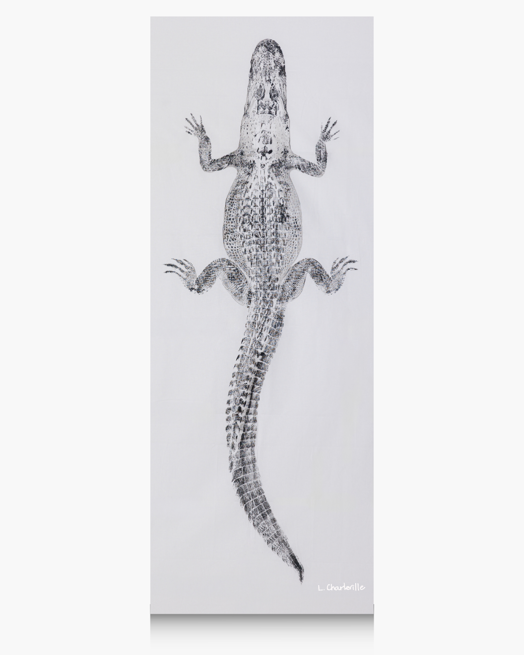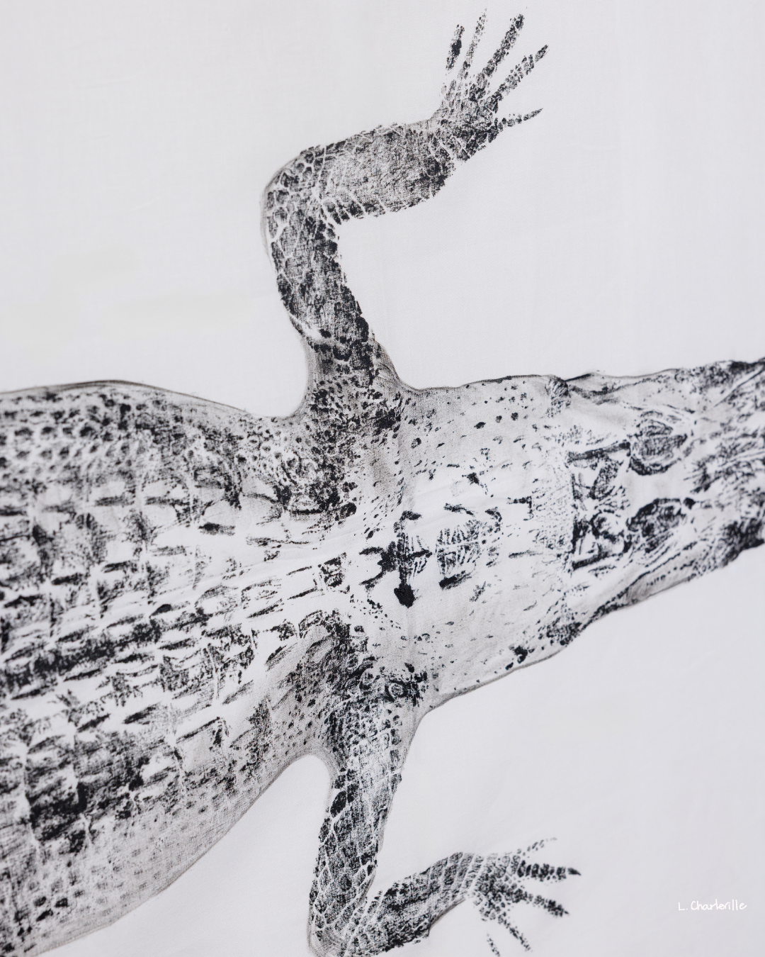 A 5' black alligator on white linen fabric with curved tail.