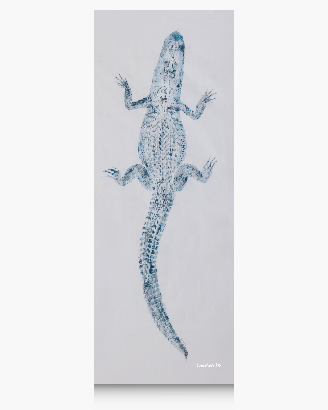 A 5' smokey blue alligator on white linen fabric with curved tail.