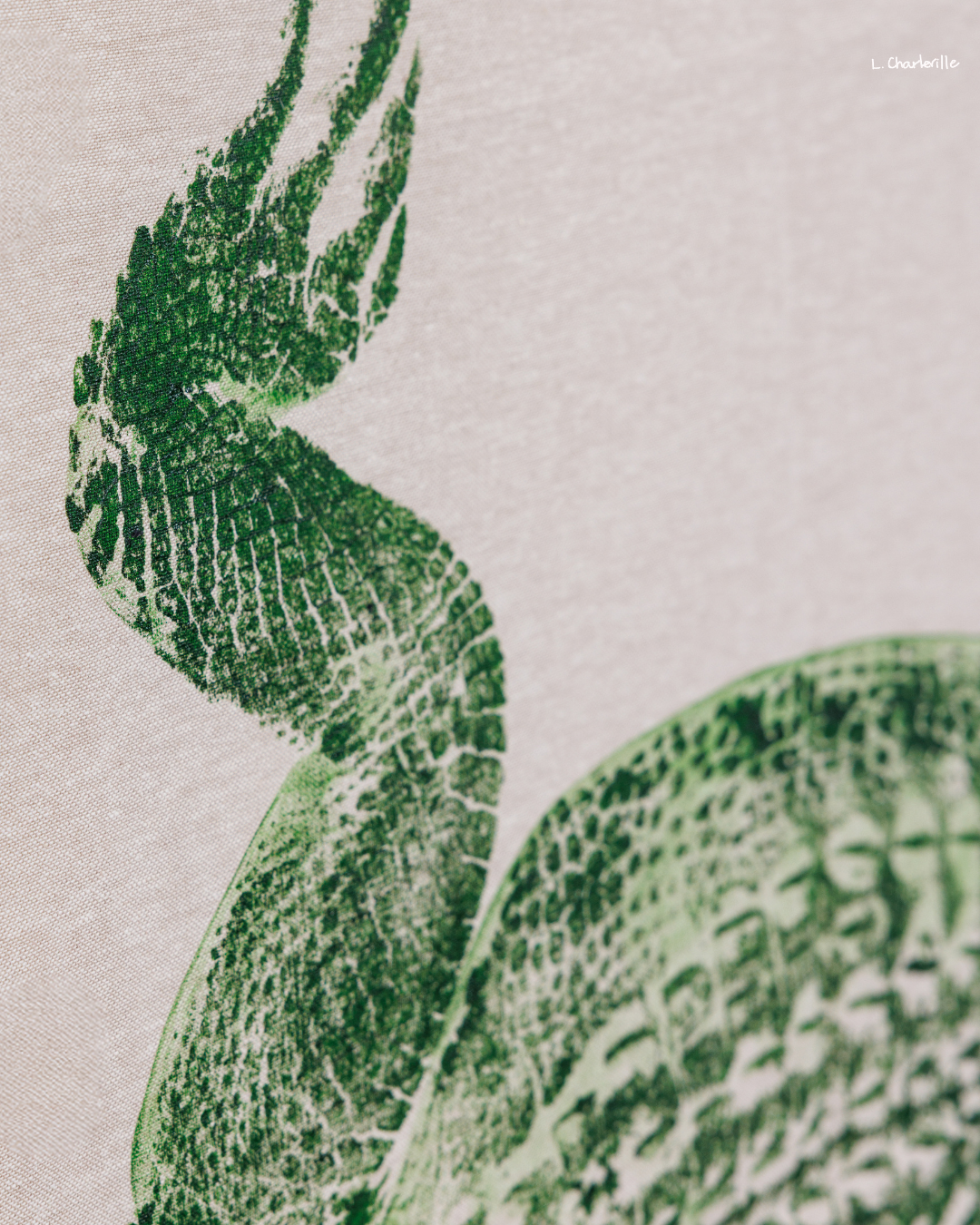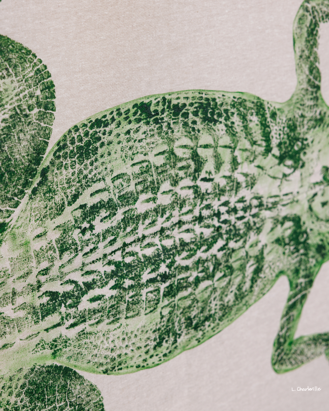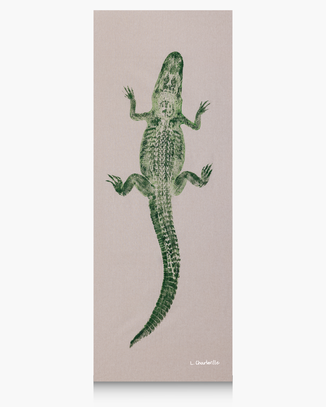 A 5' green alligator on natural linen fabric with curved tail.
